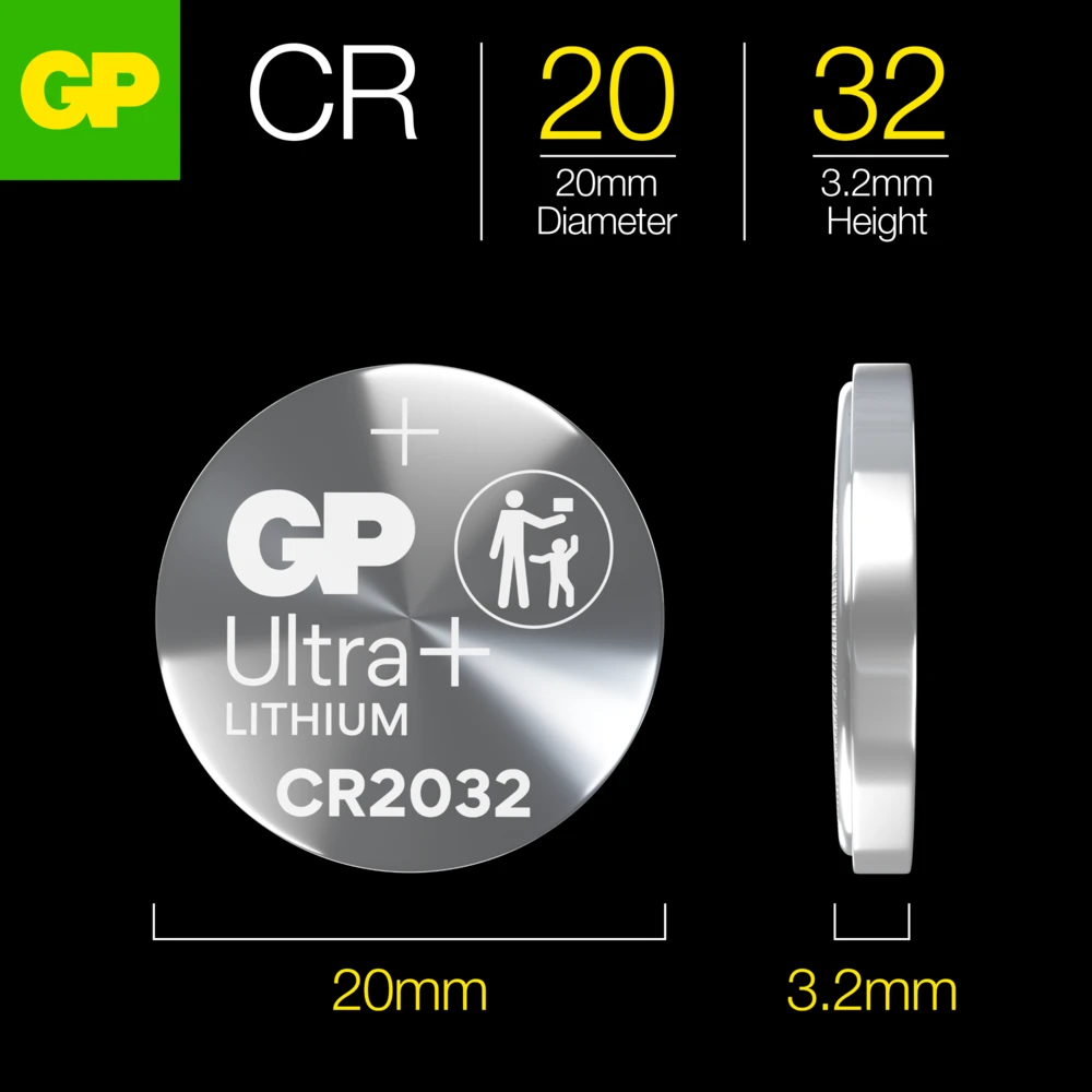 GP Ultra Plus Lithium button cell batteries CR2032 äre designed with patented Wavy Net technology for stable energy and up to 80% longer lifespan*.