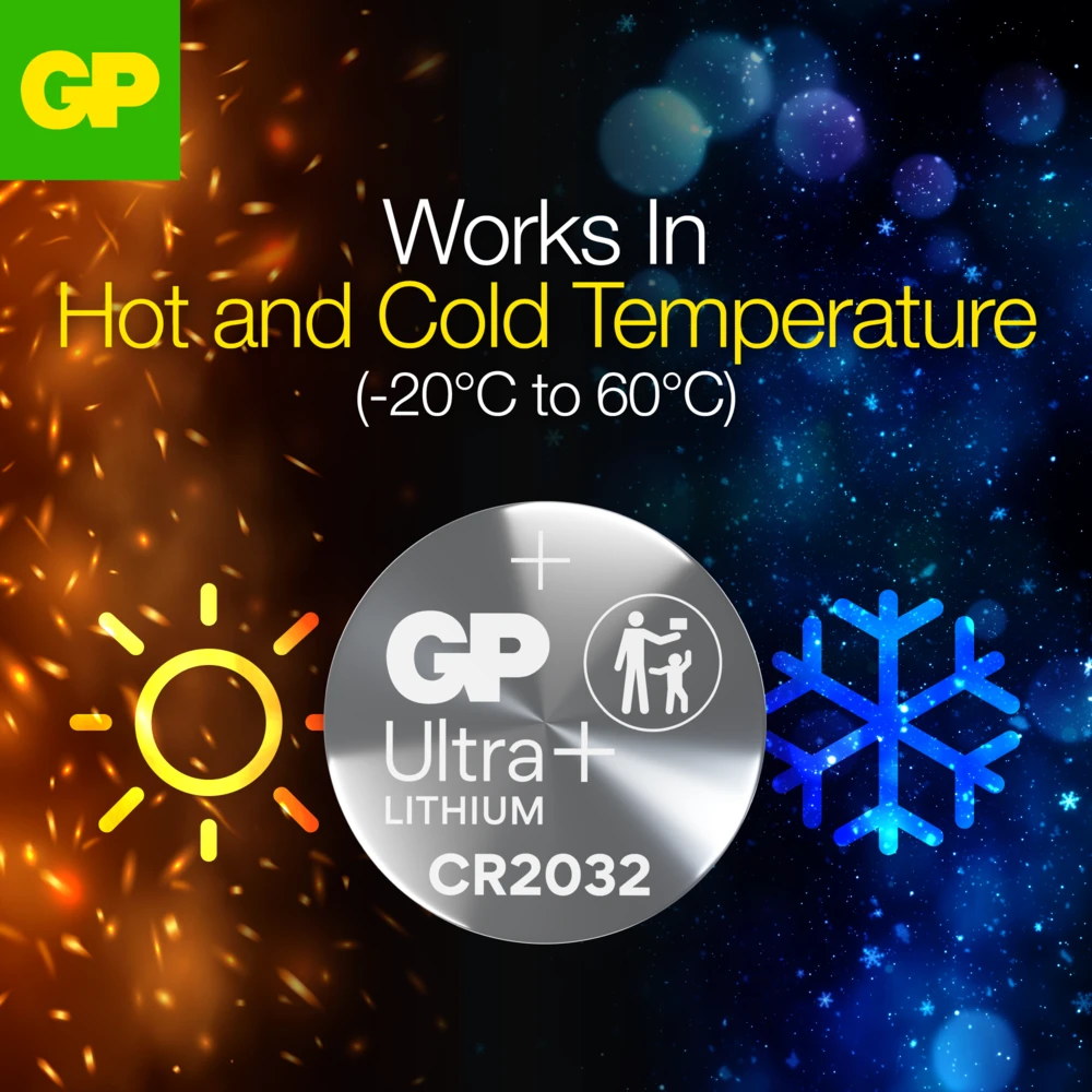 Reliable in extreme conditions – GP Ultra Plus Lithium button cell CR2032 is built to perform, from freezing winters to scorching summers. Operates reliably in temperatures from -20°C to +60°C, making these batteries ideal for outdoor work environments.