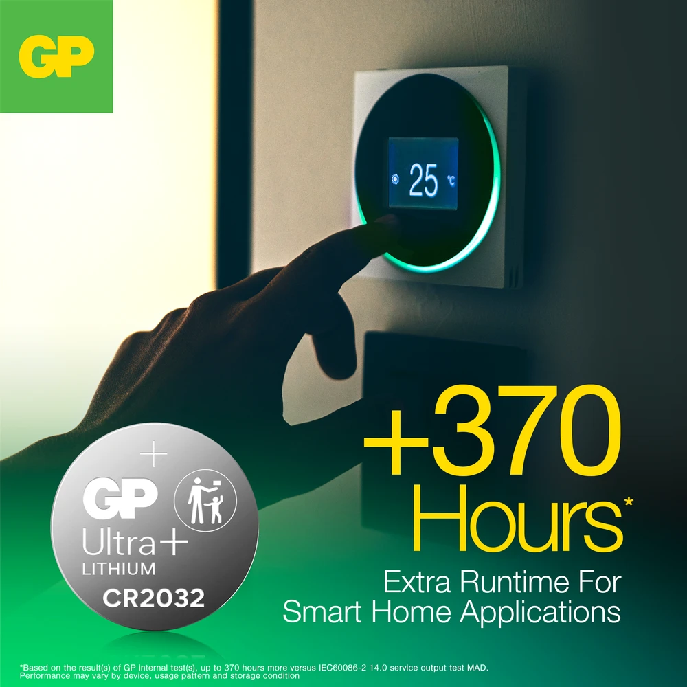 Extended operating time for smart home and IoT devices – GP Ultra Plus Lithium button cell batteries CR2032 provide up to 370 extra hours** for sensors, smart locks, and other connected devices, ensuring uninterrupted functionality.