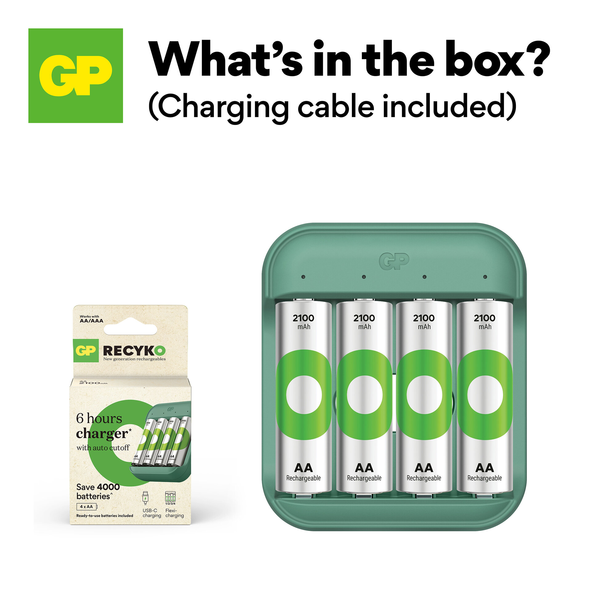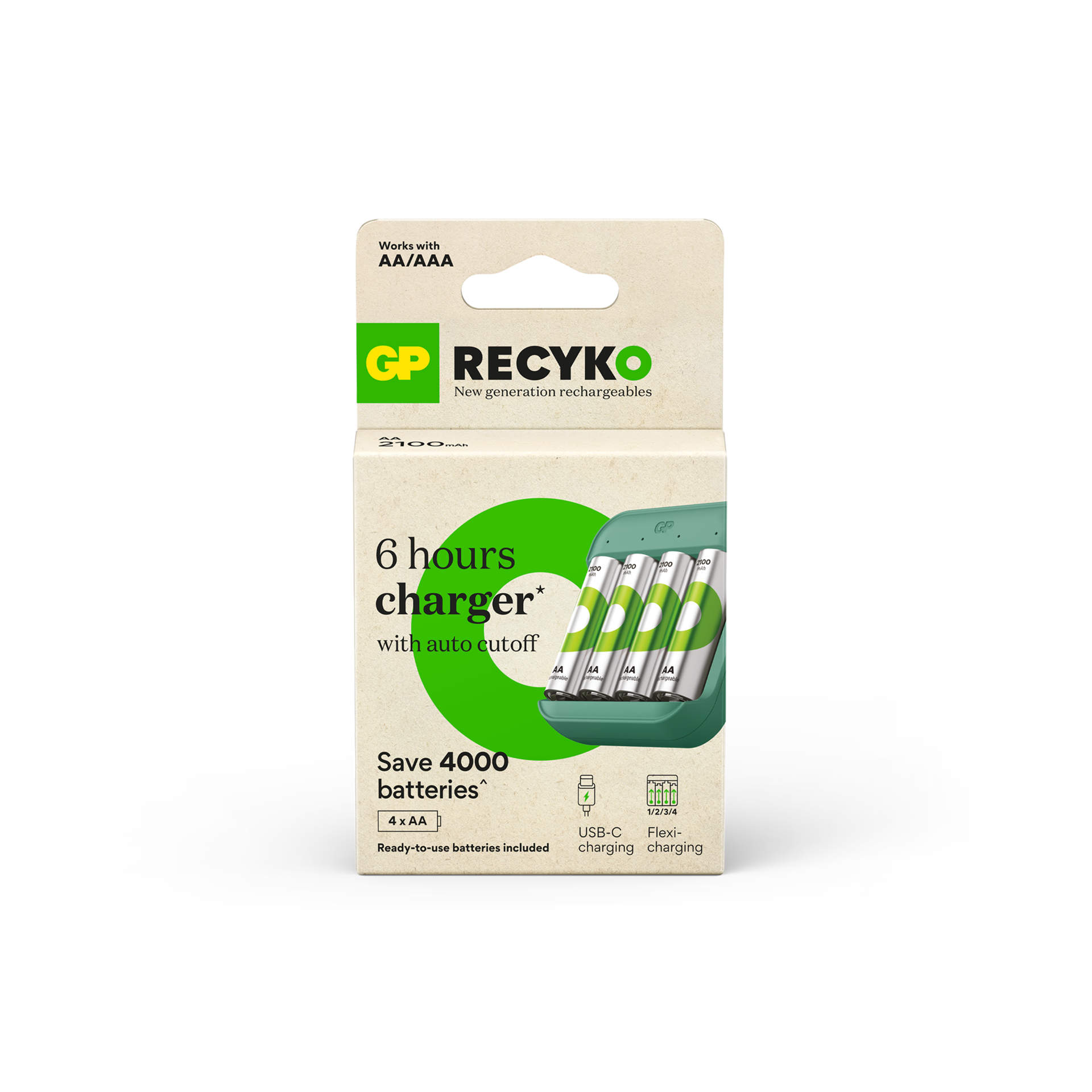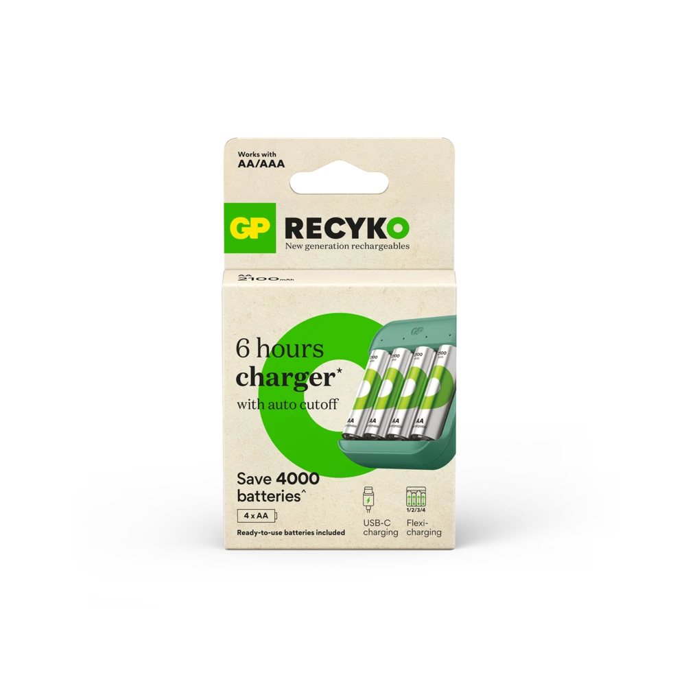 Reduce single-use battery costs and simplify your charging experience with GP Recyko B423 Charger. Charge 1 to 4 AA/AAA rechargeable batteries simultaneously via a USB-C input in 6 hours. The LED lights let you know the charge status at a glance. With bad battery detection and an auto cut-off function to prevent overcharging, you can safely and conveniently charge all your devices, from kids toys to electronics.