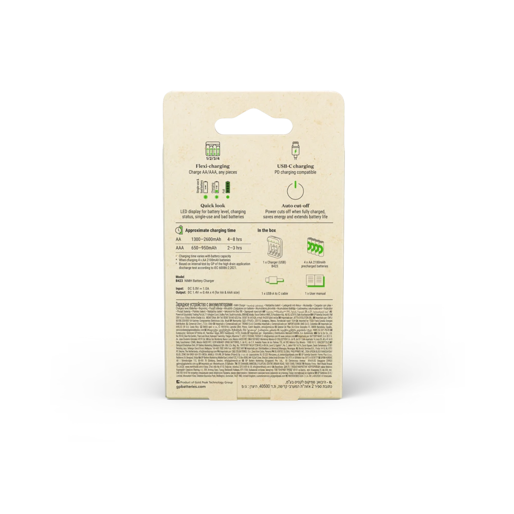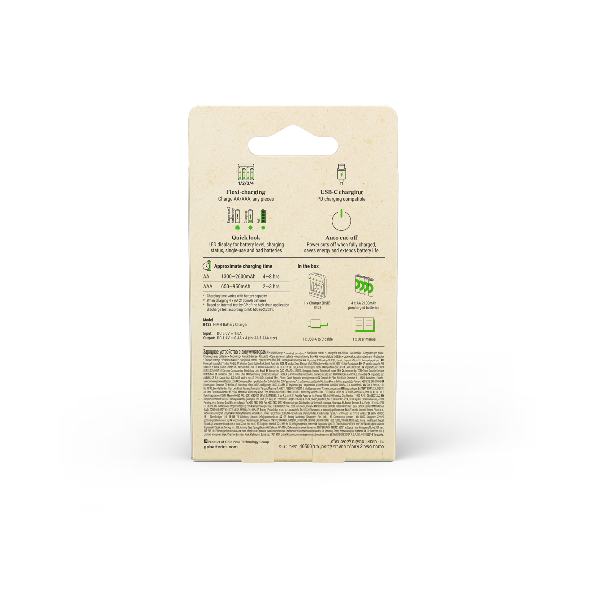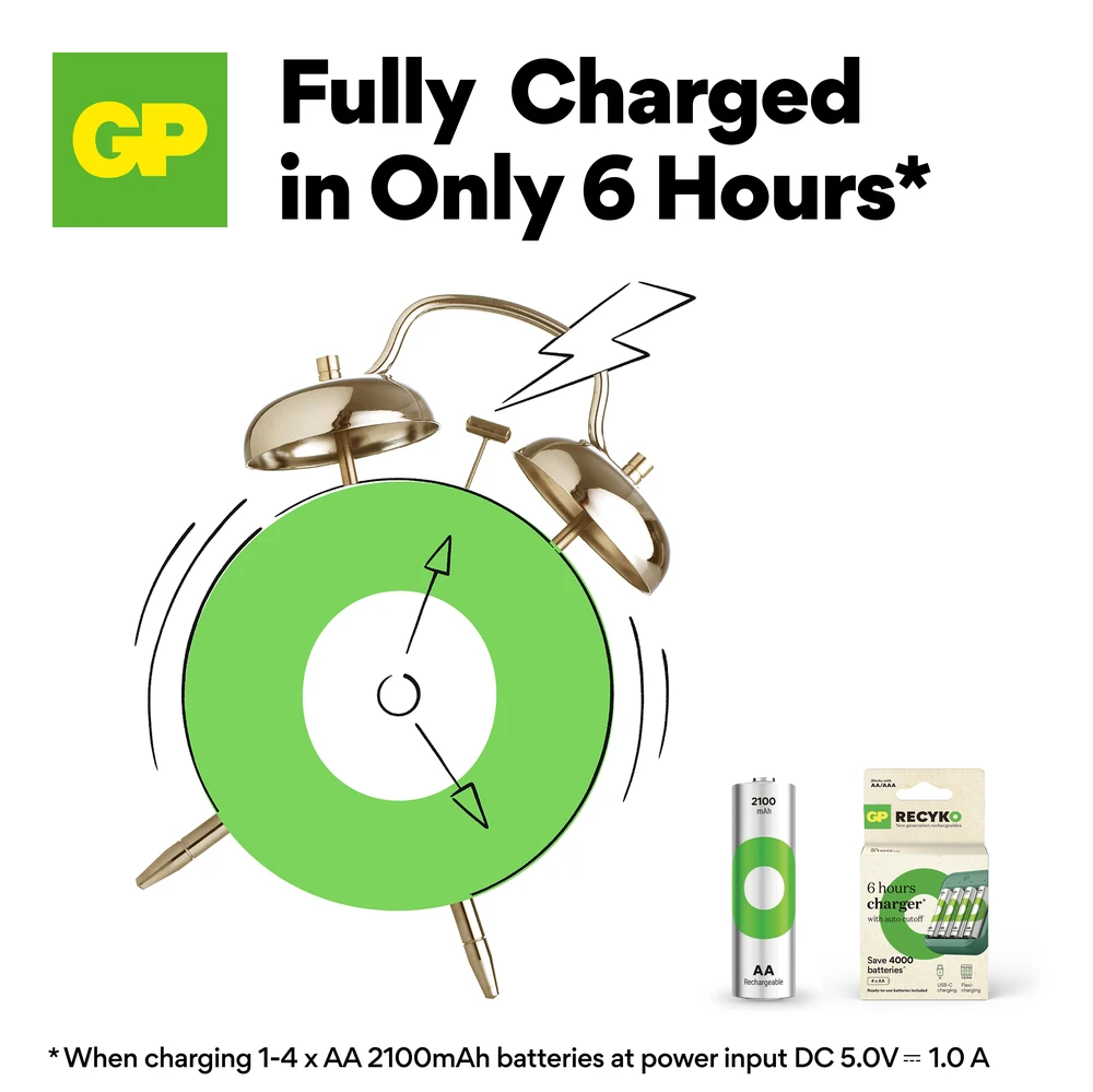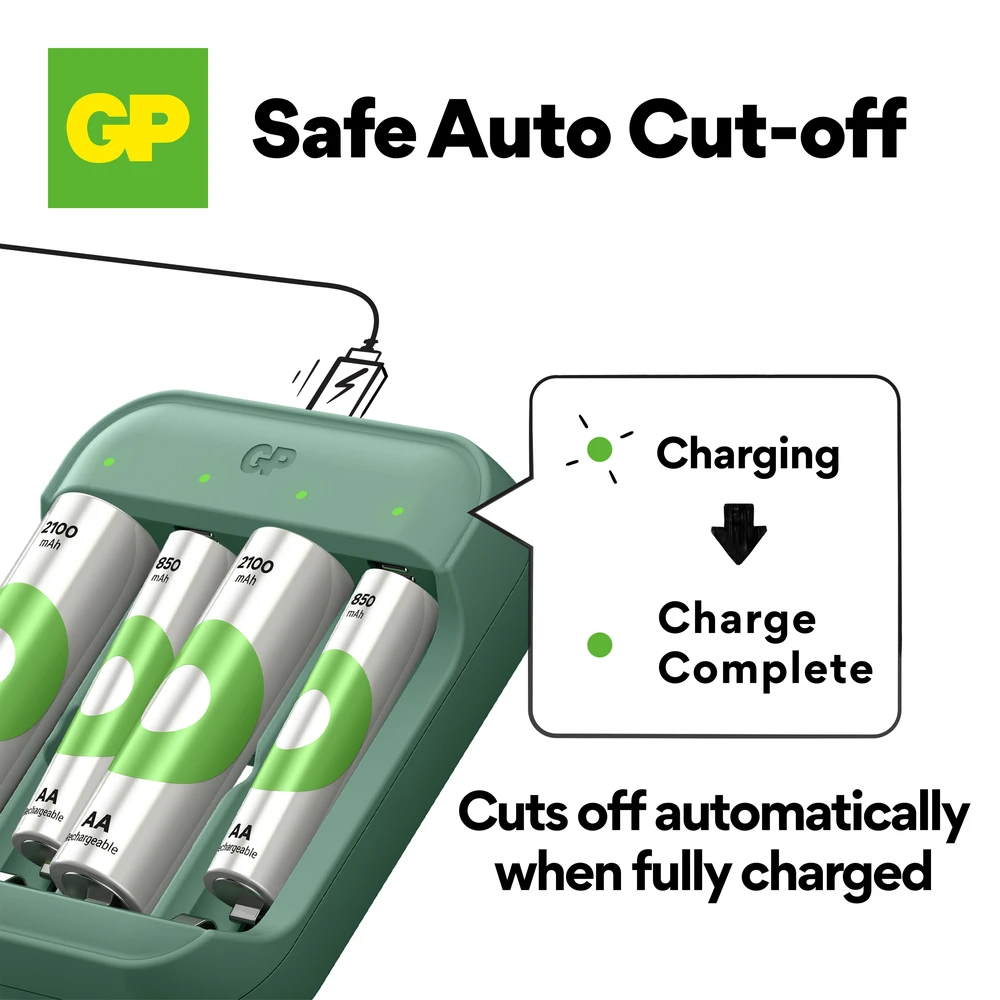 Reduce single-use battery costs and simplify your charging experience with GP Recyko B423 Charger. Charge 1 to 4 AA/AAA rechargeable batteries simultaneously via a USB-C input in 6 hours. The LED lights let you know the charge status at a glance. With bad battery detection and an auto cut-off function to prevent overcharging, you can safely and conveniently charge all your devices, from kids toys to electronics.