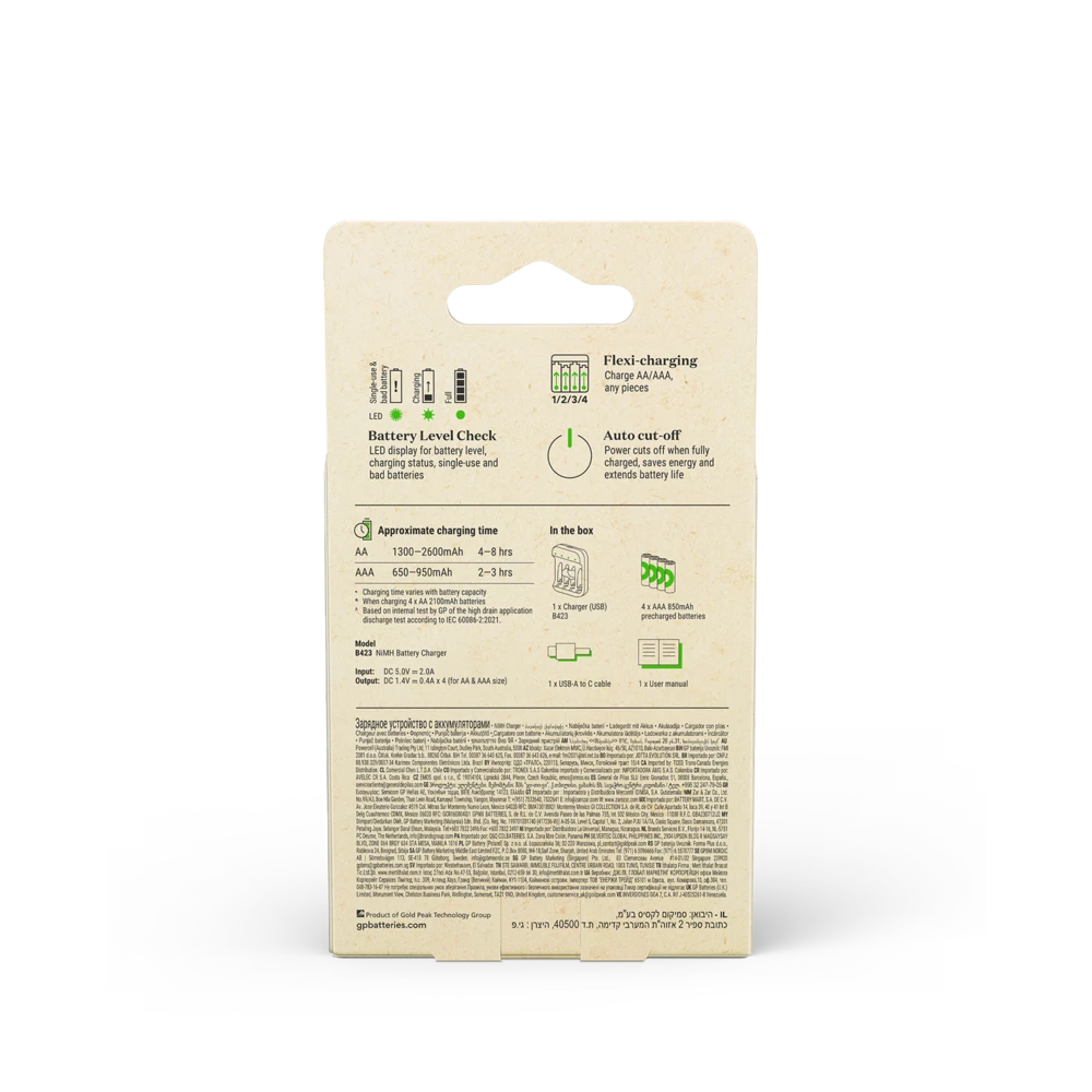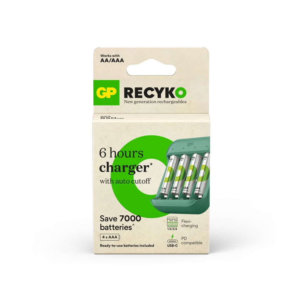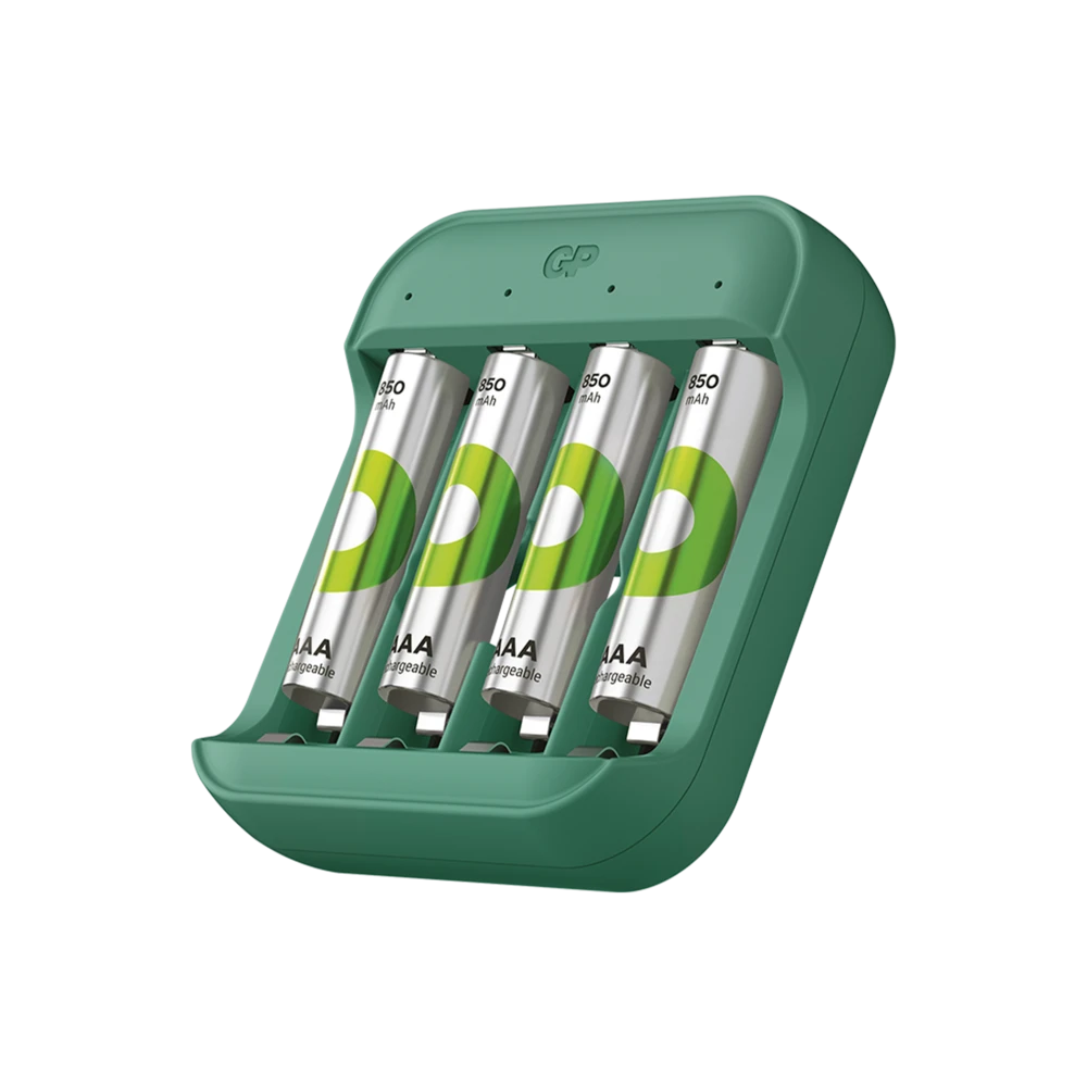 Reduce single-use battery costs and simplify your charging experience with GP Recyko B423 Charger. Charge 1 to 4 AA/AAA rechargeable batteries simultaneously via a USB-C input in 6 hours. The LED lights let you know the charge status at a glance. With bad battery detection and an auto cut-off function to prevent overcharging, you can safely and conveniently charge all your devices, from kids toys to electronics.