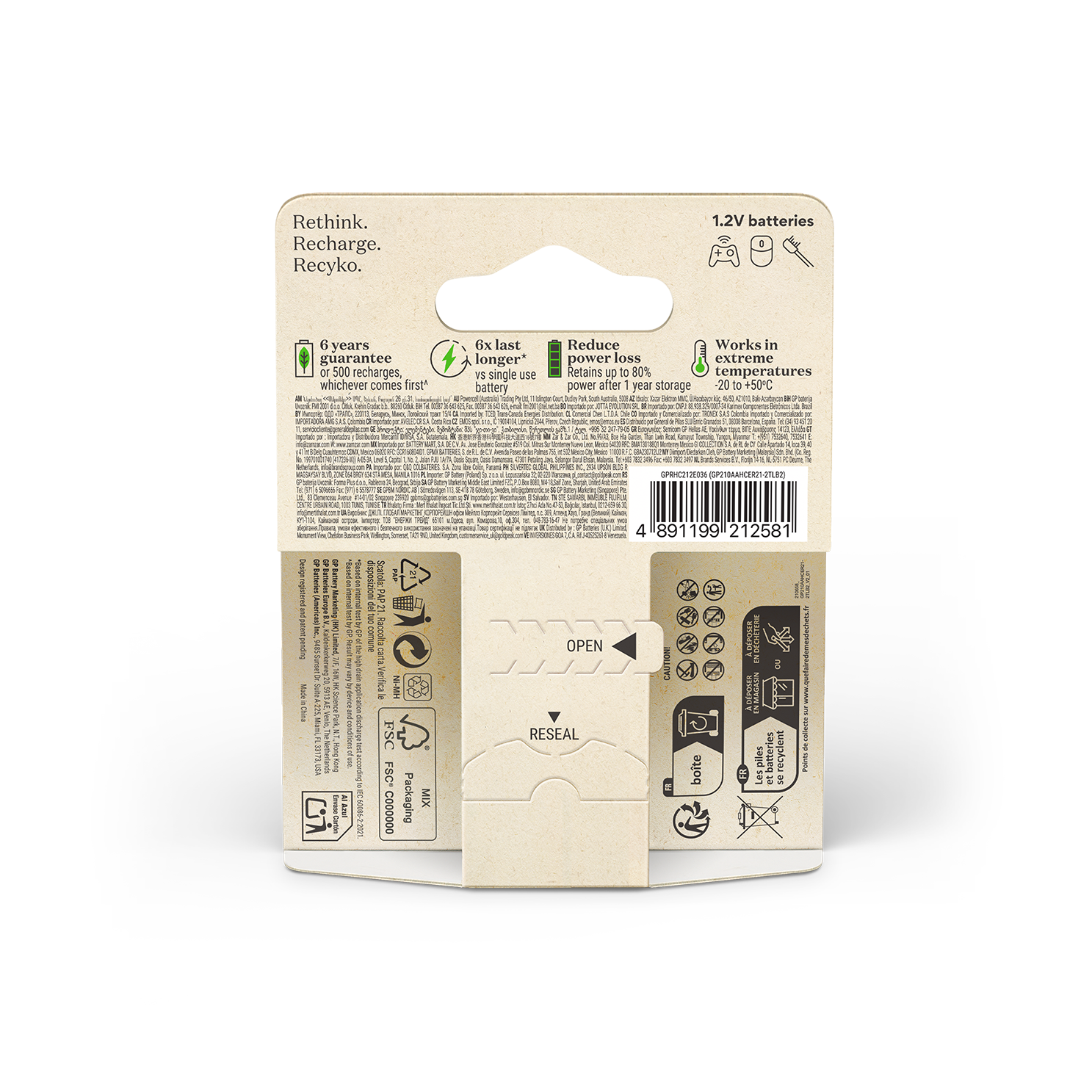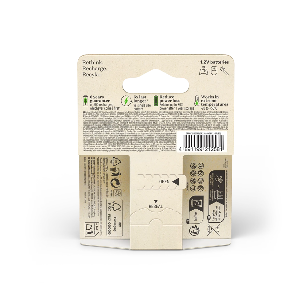 The Recyko 2100 mAh battery is a rechargeable battery designed for your everyday use. They are charged upon purchase and ready to use right out of the box. Unlike disposable batteries, ReCyko can be used at low temperatures, even down to - 20°C. The battery is also created with more than 10% recycled materials and more than 90% of the battery, including packaging, is recyclable.