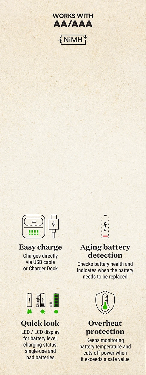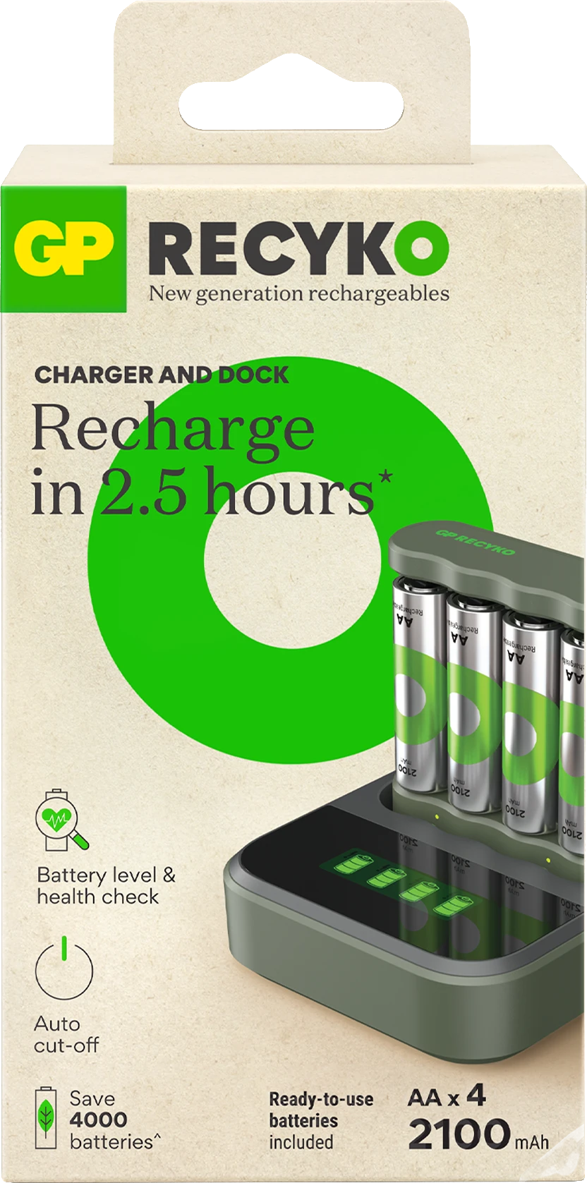 Introducing the new, advanced ecosystem of rechargeable batteries, battery chargers and charging docks from GP Recyko. With its optimal performance, smart features and stylish design, the new range will help you dispense with thousands of disposable batteries - putting less pressure on the environment and your wallet.