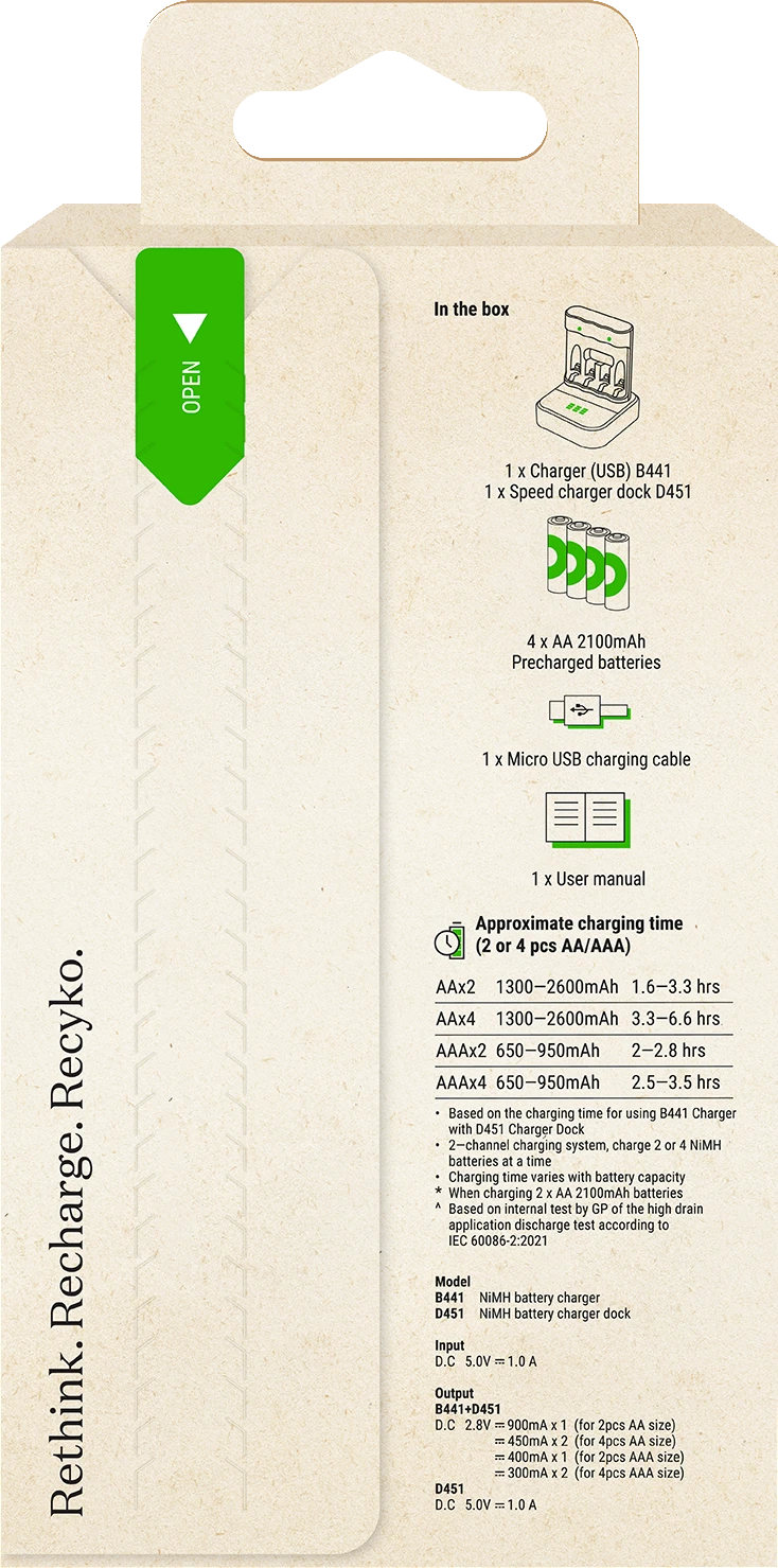GP Recyko Everyday charger B441 (USB) with docking station D451, incl. 4 x AA 2100mAh NiMH-batteries