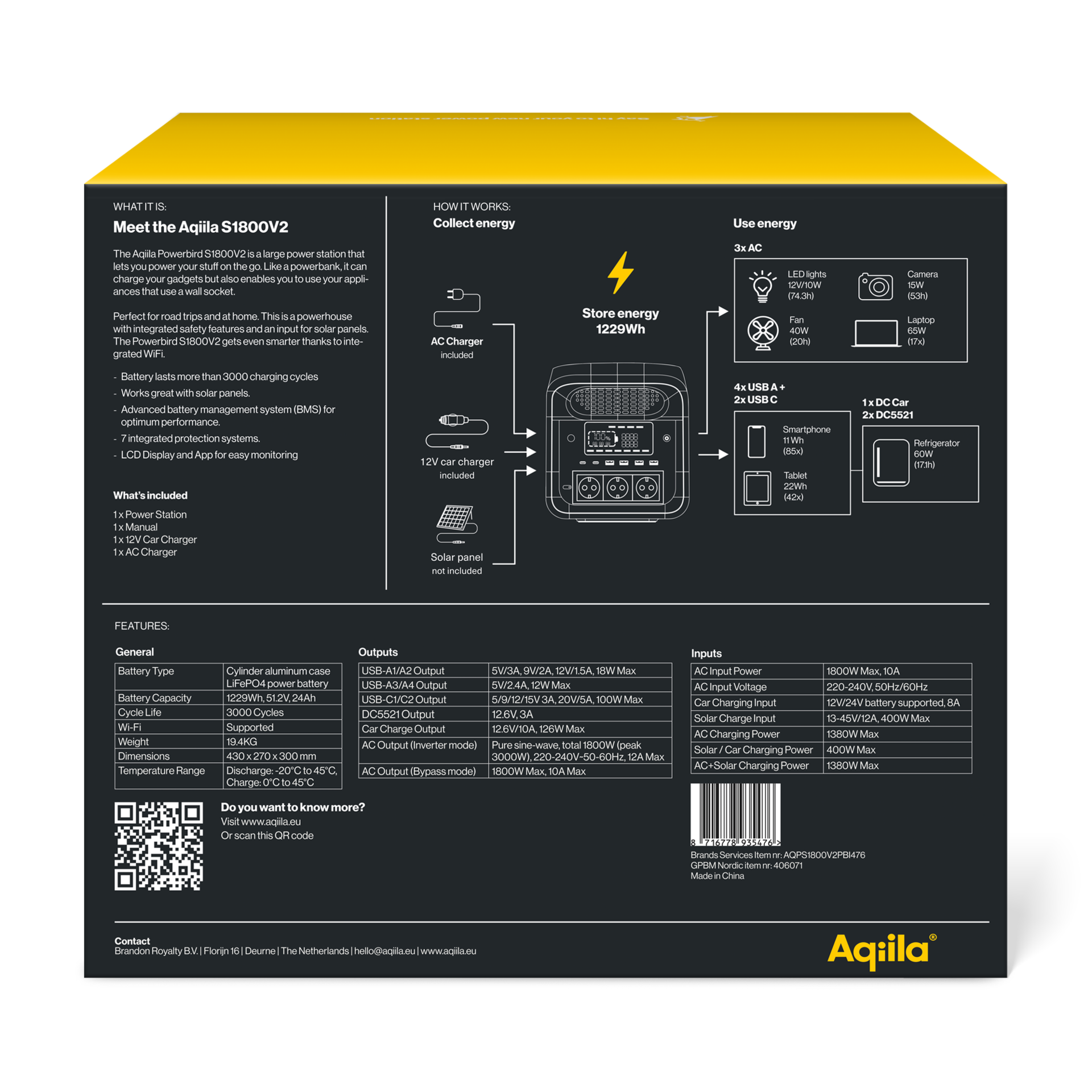 Reliable mid-range power – 1800W that can peak up to 3000W. The LiFePO4 battery delivers 1229Wh with 3000 charge cycles.