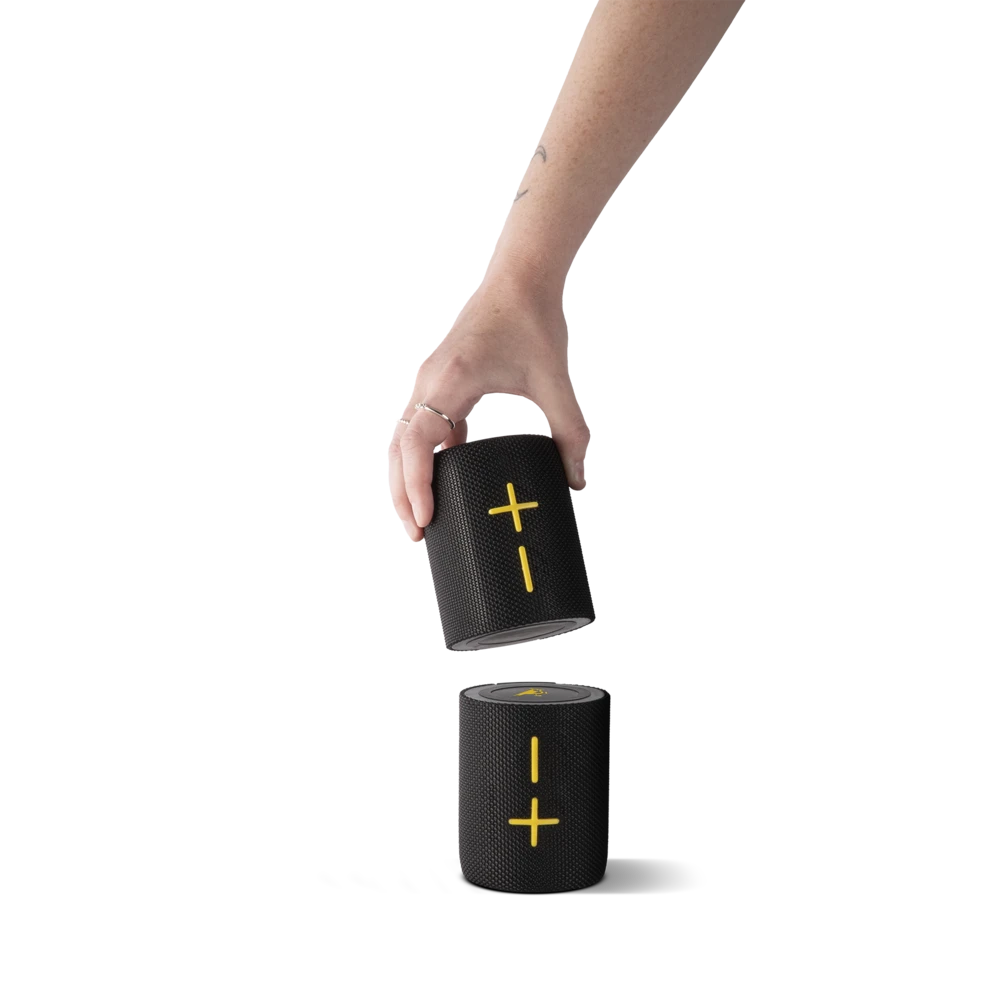 Portable 2-in-1 stereo speaker that twists apart into two wireless units. Waterproof, magnetic, and ready for immersive sound anywhere.